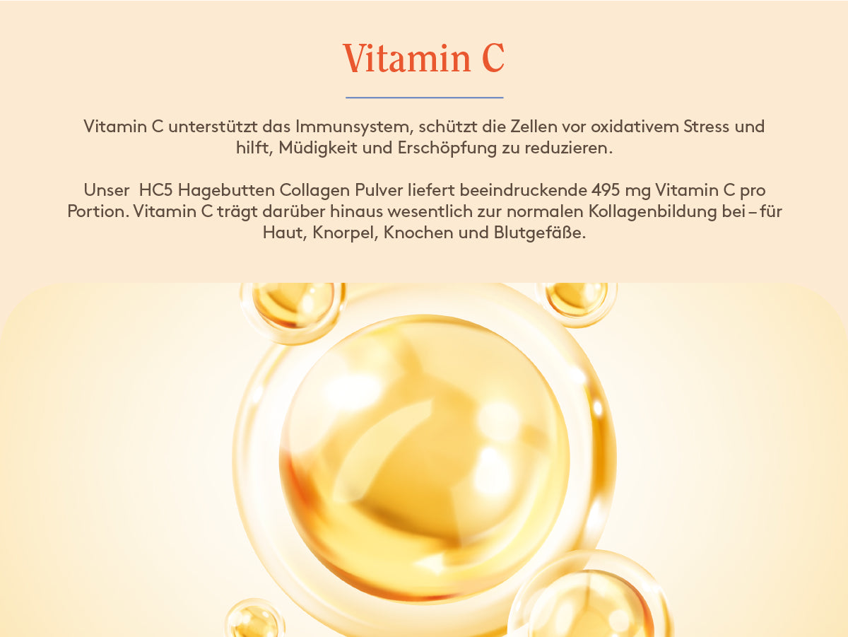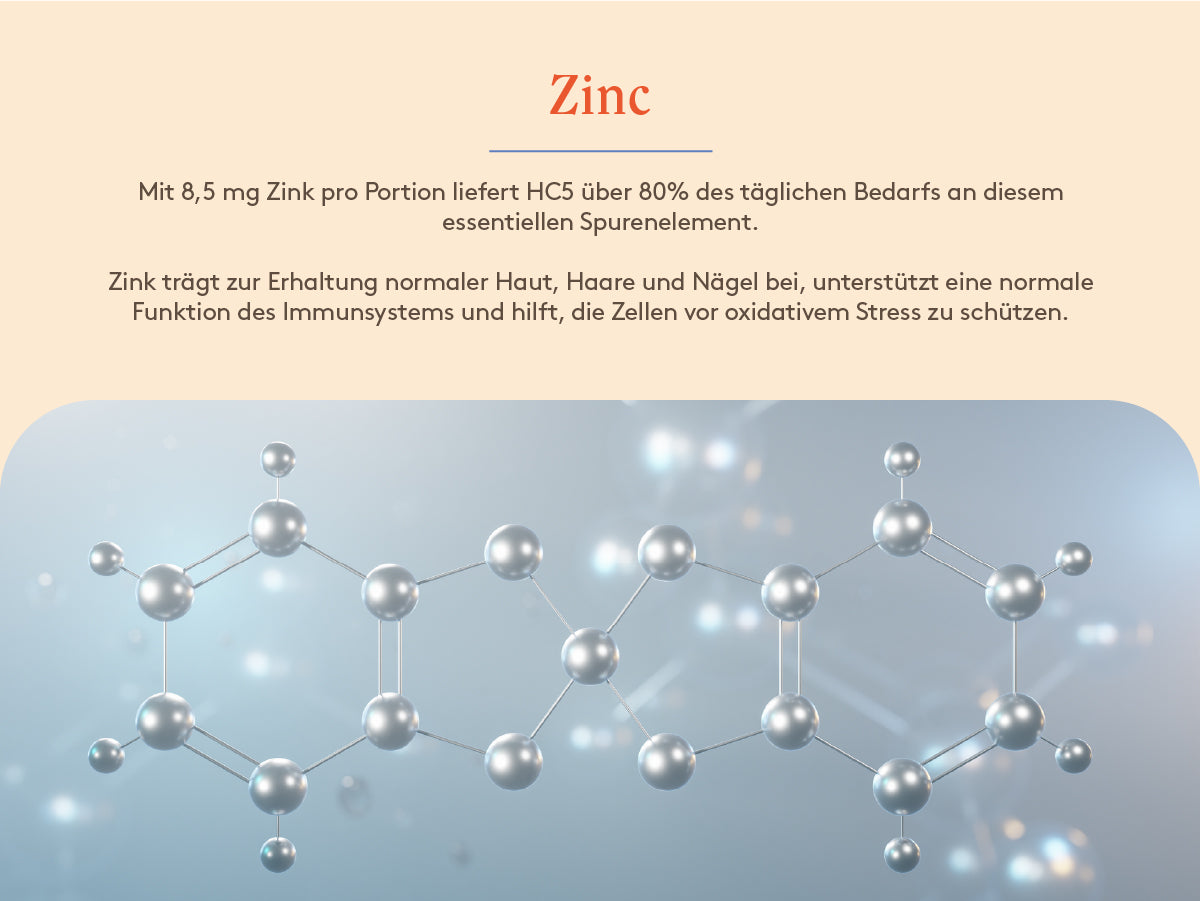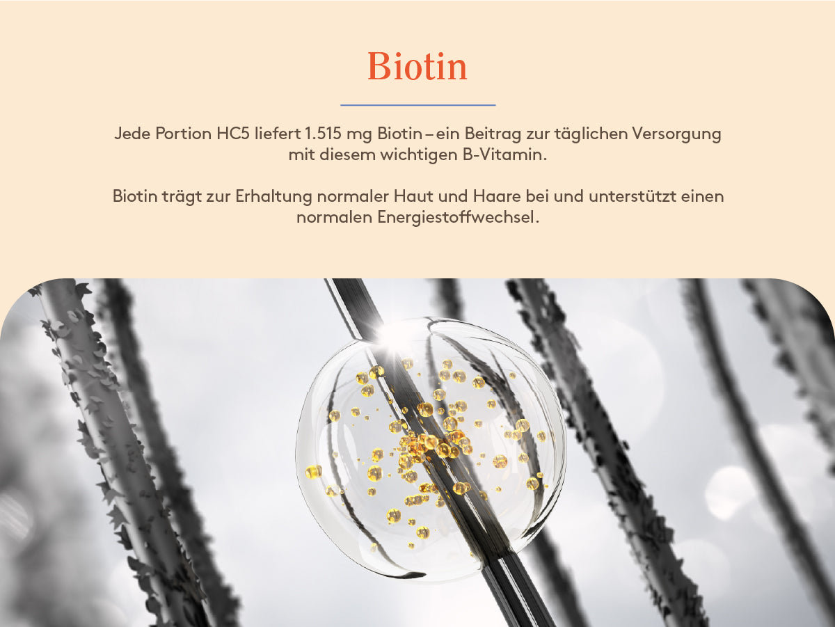 HC5 enthält nur natürliche Nährstoffe, die die normalen Schönheitsfunktionen deines Körpers unterstützen. Wir empfehlen jedoch, vor dem Beginn mit deinem Gesundheitsdienstleister zu sprechen, besonders wenn du Medikamente nimmst oder spezifische Gesundheitszustände hast.