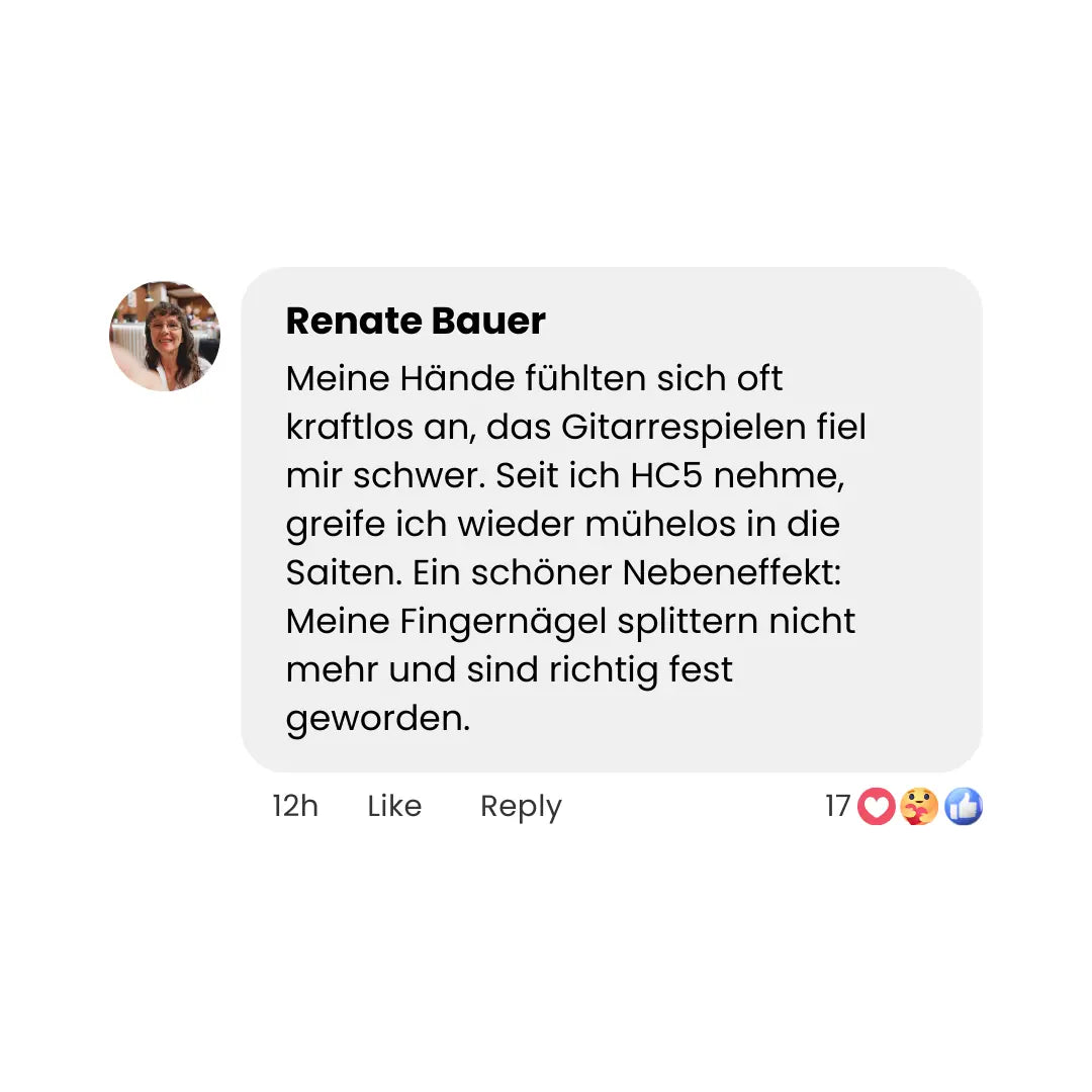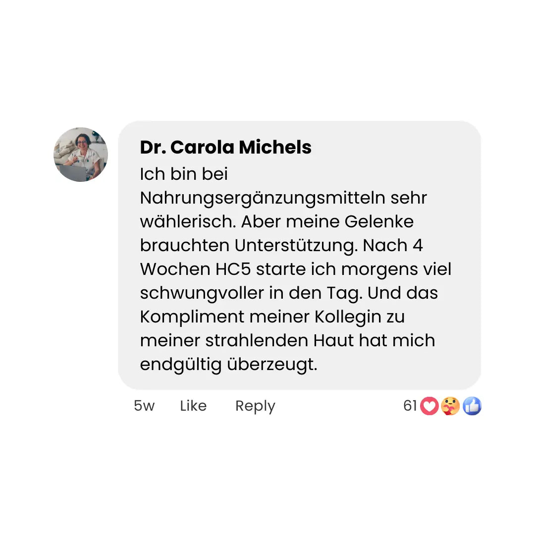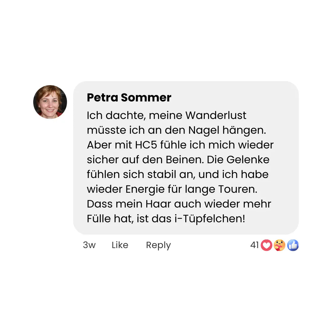 "Ich dachte immer, Gelenkprobleme und dünneres Haar gehören zum Älterwerden dazu. HC5 hat mir gezeigt: Das muss nicht sein. Ich fühle mich heute fitter und attraktiver als vor 5 Jahren. Danke für dieses neue Lebensgefühl!"
