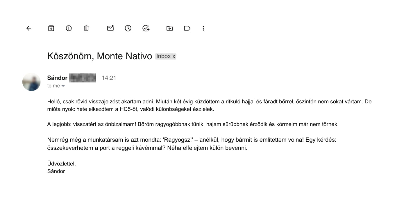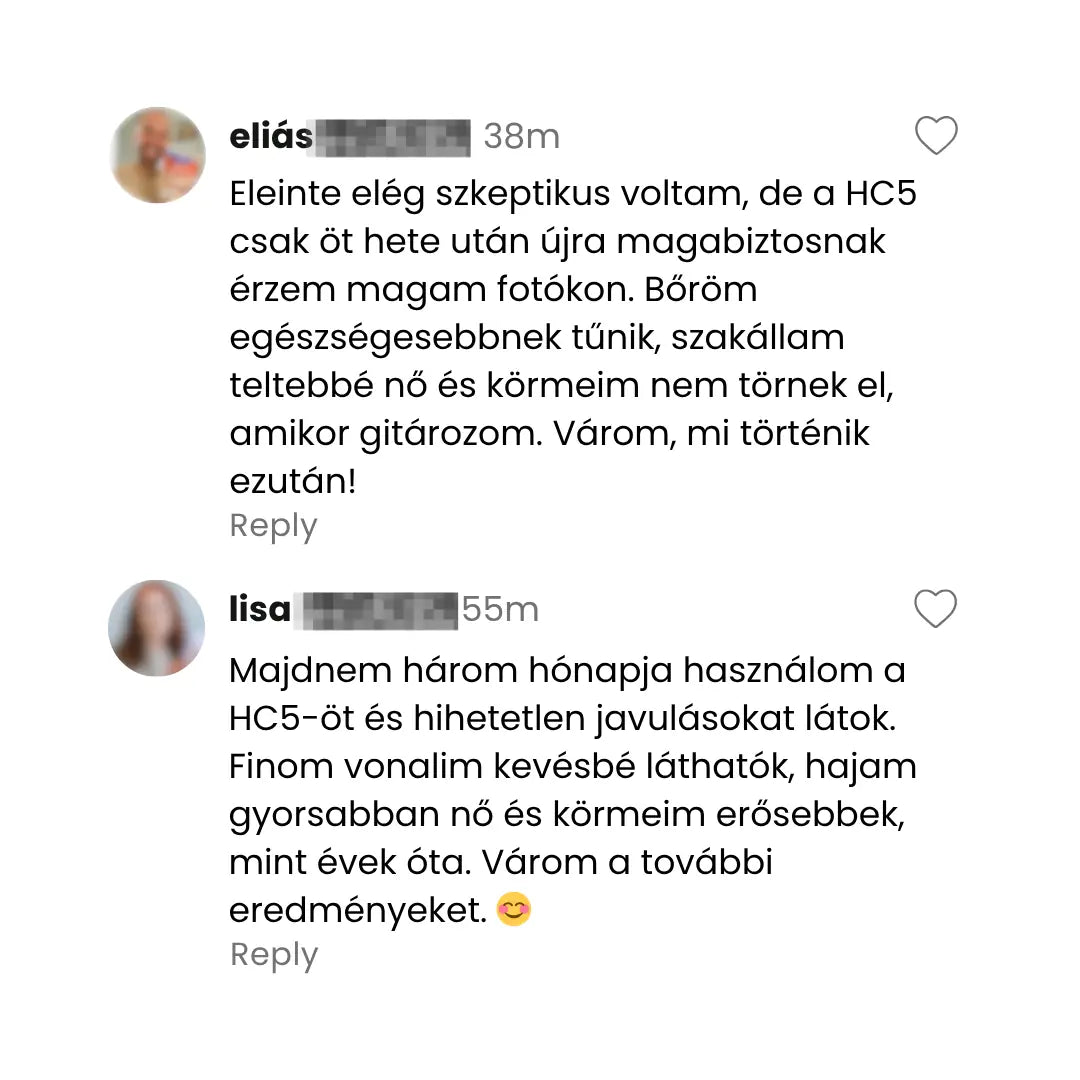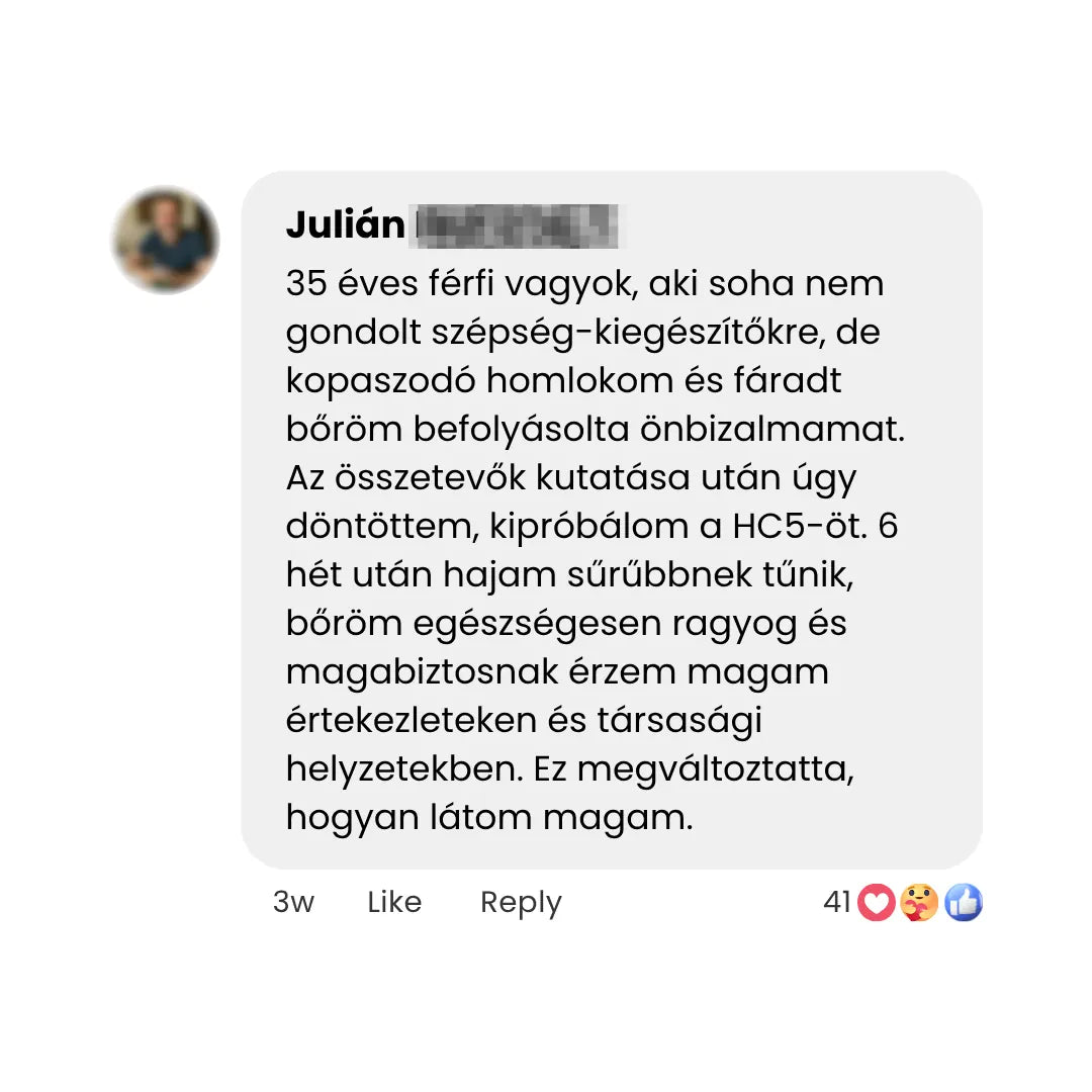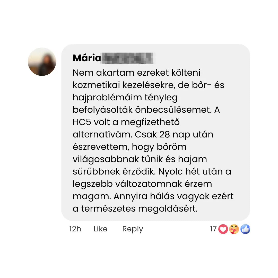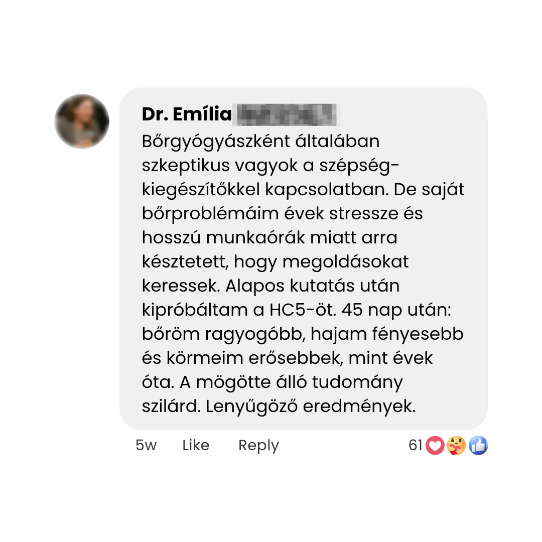 Ahelyett, hogy drága kezelésekre hagyatkoznának, amelyek csak átmenetileg hatnak a felszínen, egy természetes, mélyen ható megoldásban bíznak. Nincs agresszív vegyi program, nincs smink mögé bújás – hanem látható vitalitás a bőr, haj és körmök számára. A HC5 azt nyújtja, amit a hagyományos kozmetikumok csak ígérnek.