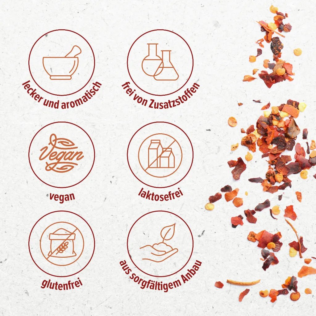 • 100 % Rein & Natürlich: Hergestellt aus hochwertigen, getrockneten Chiliflocken – ganz ohne Zusatzstoffe.