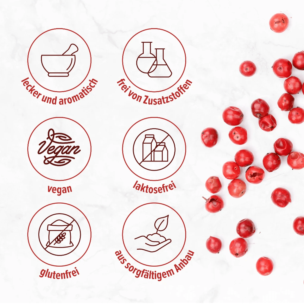 • 100% čisté a prírodné: Vyrobené z vysoko kvalitných, celých ružových korenia, bez prísad.
