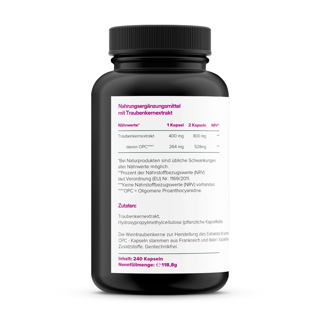 • Natürliches Pflanzenstoff: OPC ist ein Inhaltsstoff aus Traubenkernen, der in der Natur vorkommt.