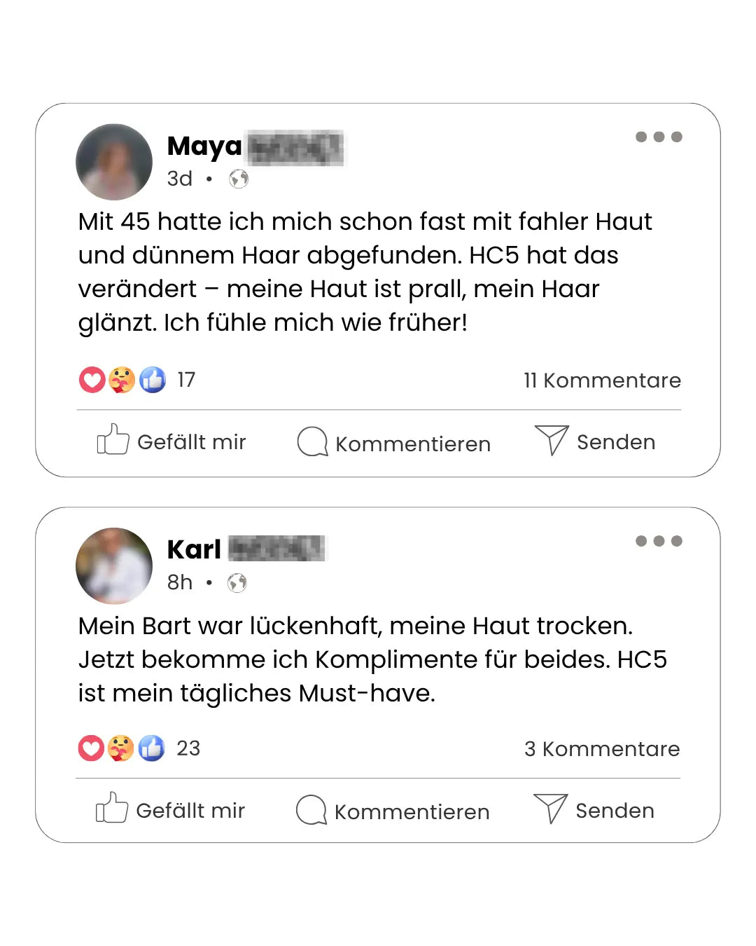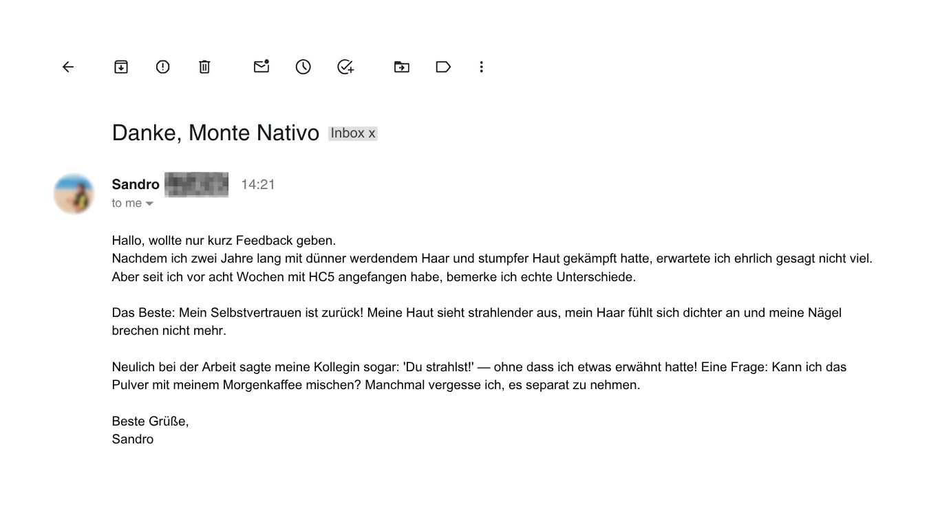 "Ja — es ist möglich, wieder strahlende Haut, glänzendes Haar und starke Nägel zu haben. In jedem Alter. Dank HC5 entdecken Tausende von Menschen ihr natürliches Schönheitsselbstvertrauen wieder."