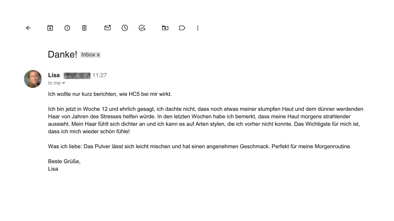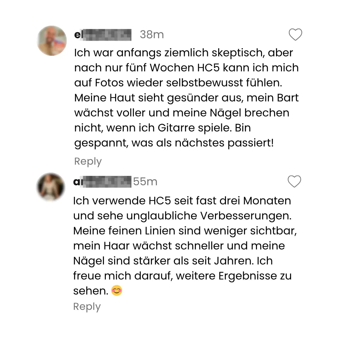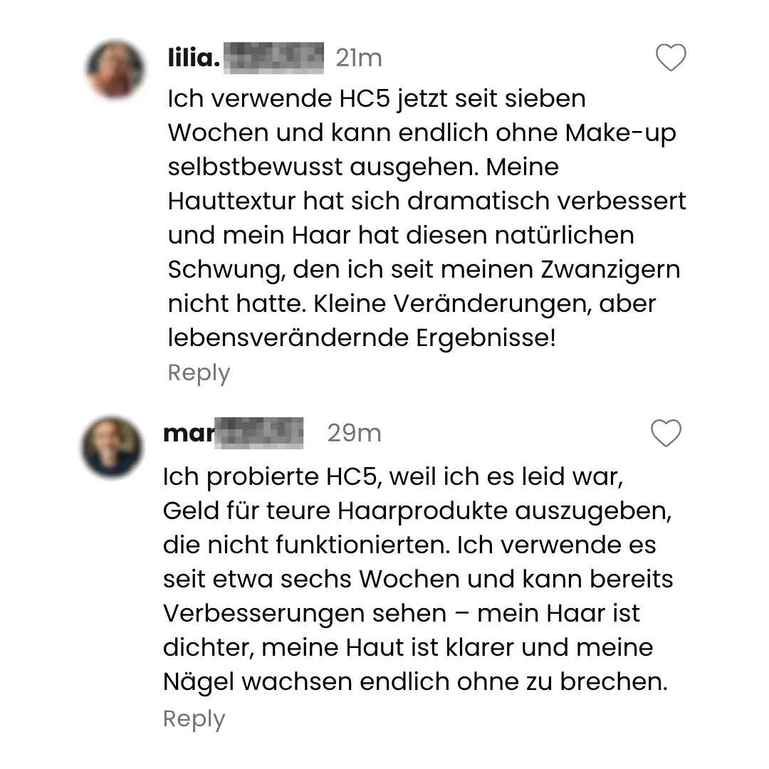Meine Haut war vorher müde, mein Haar dünn, meine Nägel brüchig. Nach nur 6 Wochen mit HC5: Strahlender Teint, dichteres Haar, starke Nägel – und Komplimente nonstop.